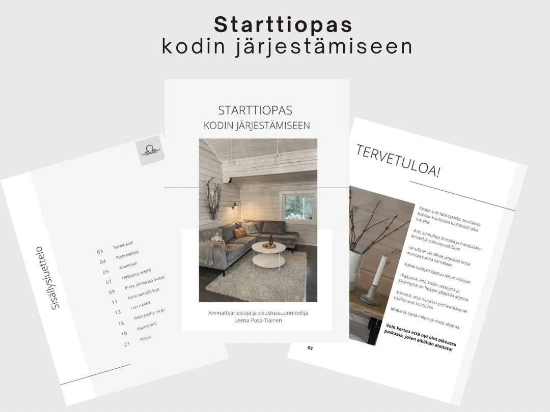 Opas sisältää eri osioita ja niissä kaikissa on tehtäviä, jotka helpottaa aloittamista ja vie sinua selkeästi eteenpäin oman kodin järjestämisessä!